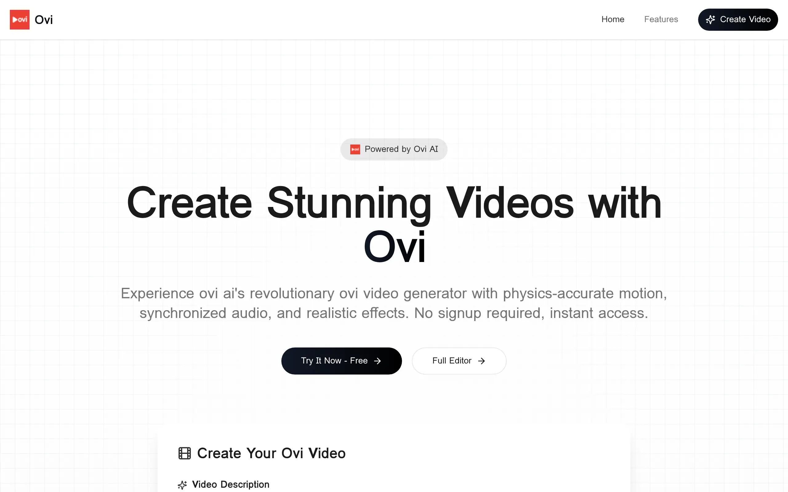 That's where Ovi comes in. This free AI video tool lets you type what you want and watch it come to life as a polished video complete with smooth motion and synced audio. No signup, no credit card, no experience needed.