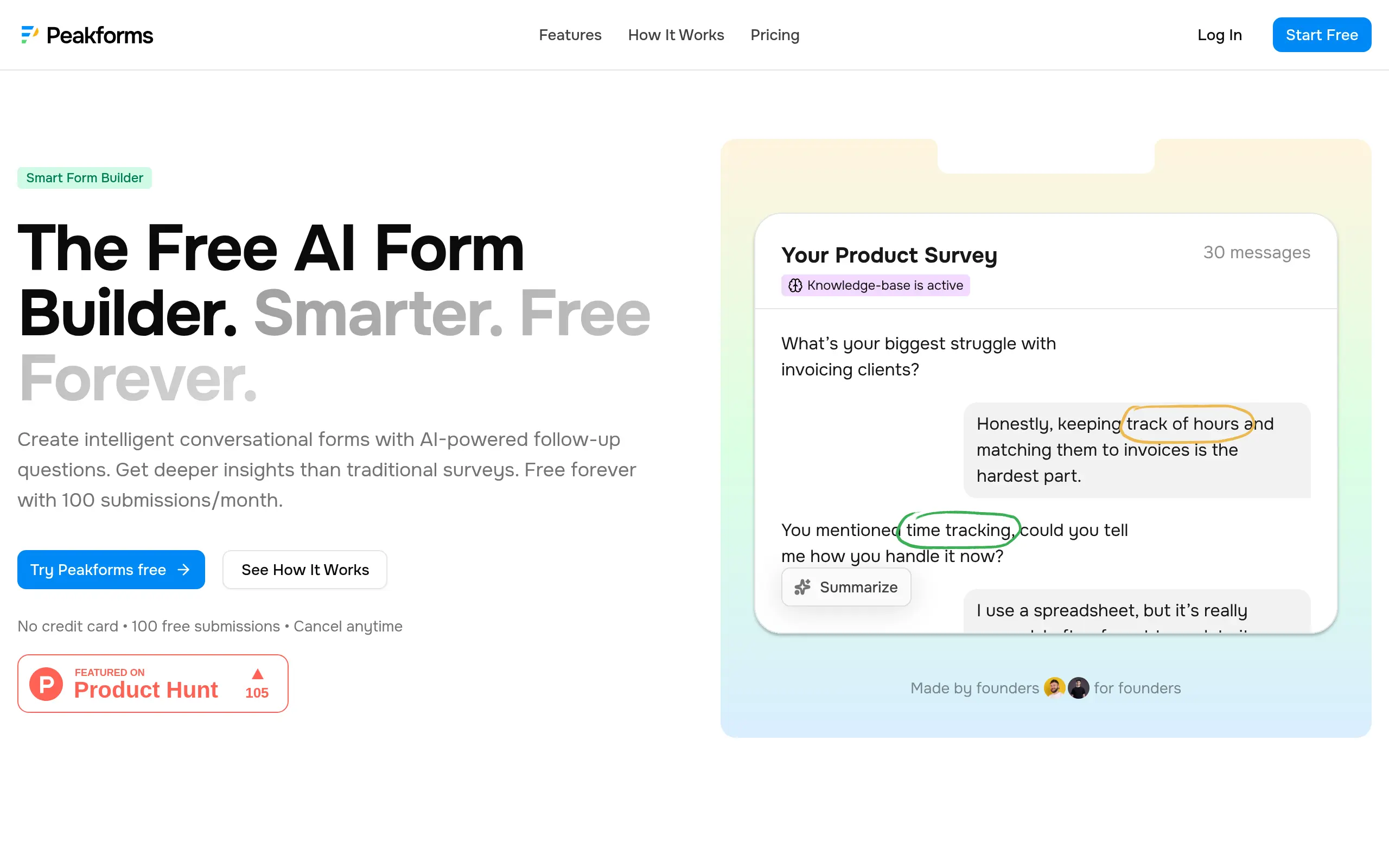 Peakforms offers a free tier that includes 1 form, 100 submissions per month, and full AI features including knowledge base integration and chat functionality.
