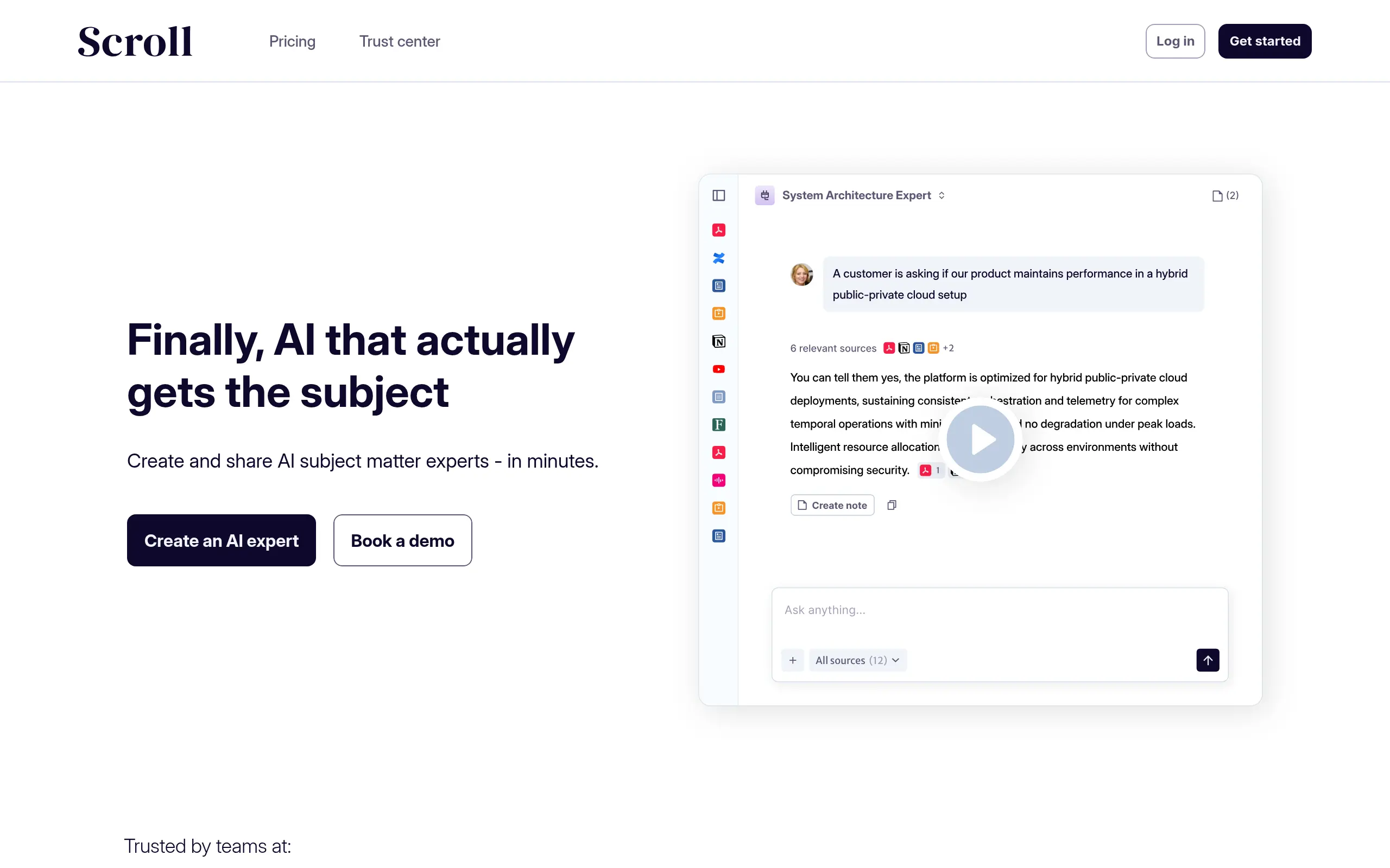 That's where Scroll comes in – it's like having a team of subject matter experts on standby, ready to help you make smarter decisions without the hefty consulting fees. This AI platform turns your scattered knowledge sources into accessible, conversational experts that actually remember what you talked about last time.